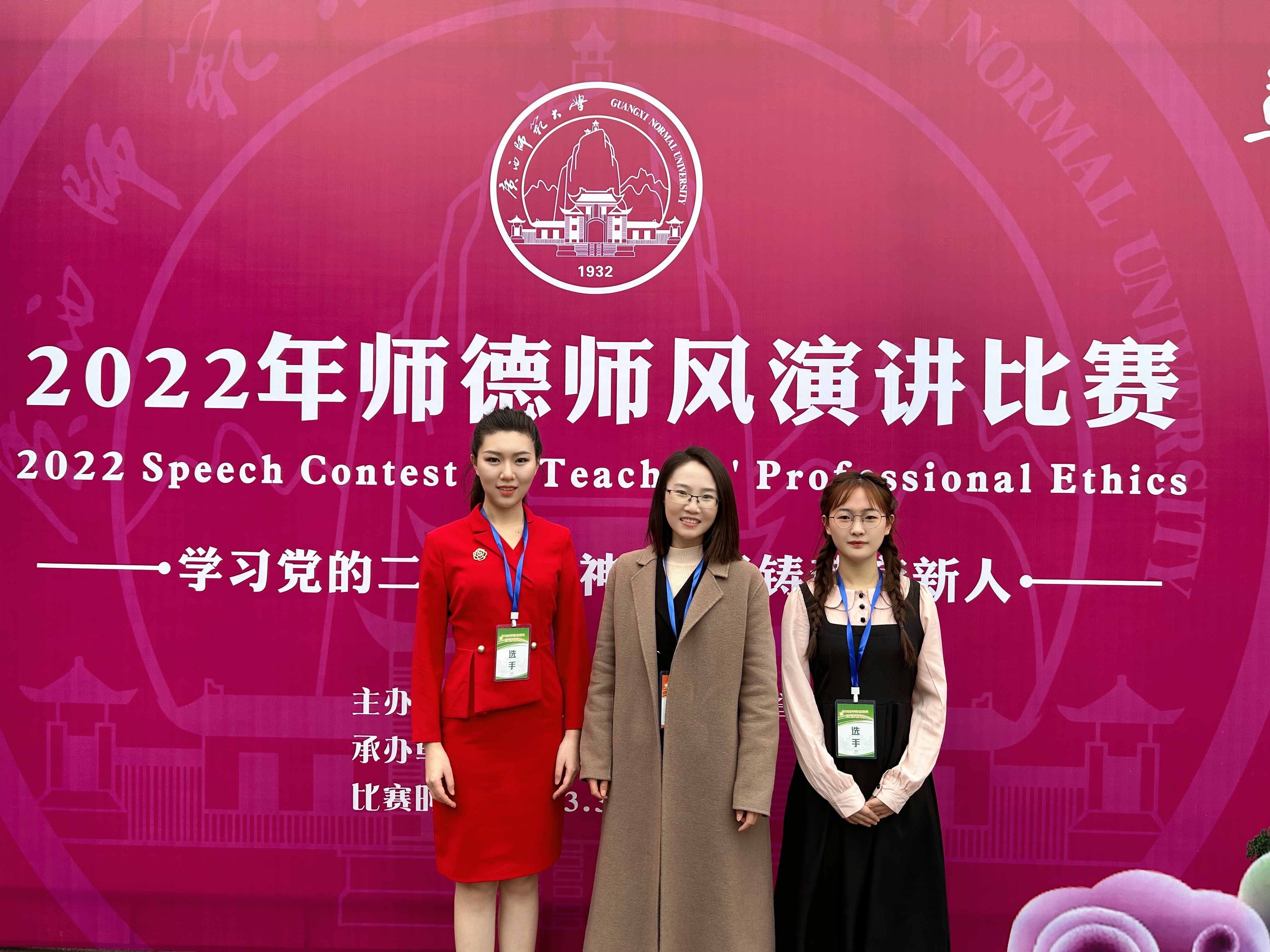 2023年3月17日-19日,由广西壮族自治区教育厅主办的2022年师德师风演讲比赛在广西师范大学育才校区举行,本次演讲比赛以“学习党的二十大精神 培根铸魂育新人”为主题。我校人文教育学院学前教育专业2003班隋媛和2101班徐梦璐参赛,其中2003班隋媛同学凭借稳定的发挥,喜获高校师范生组三等奖的佳绩。