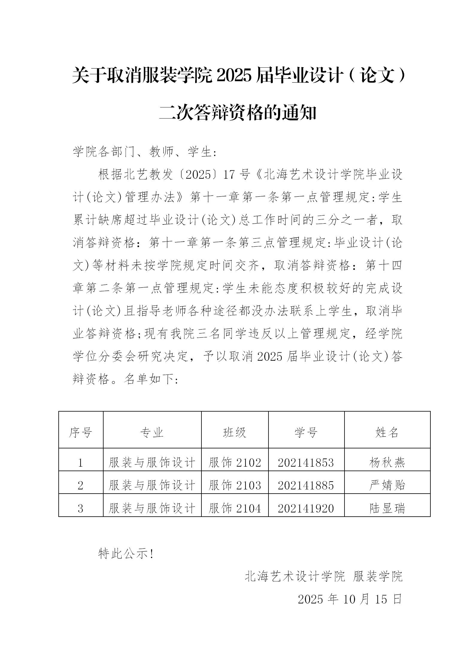 关于取消服装学院2025届毕业设计(论文)二次答辩资格的通知