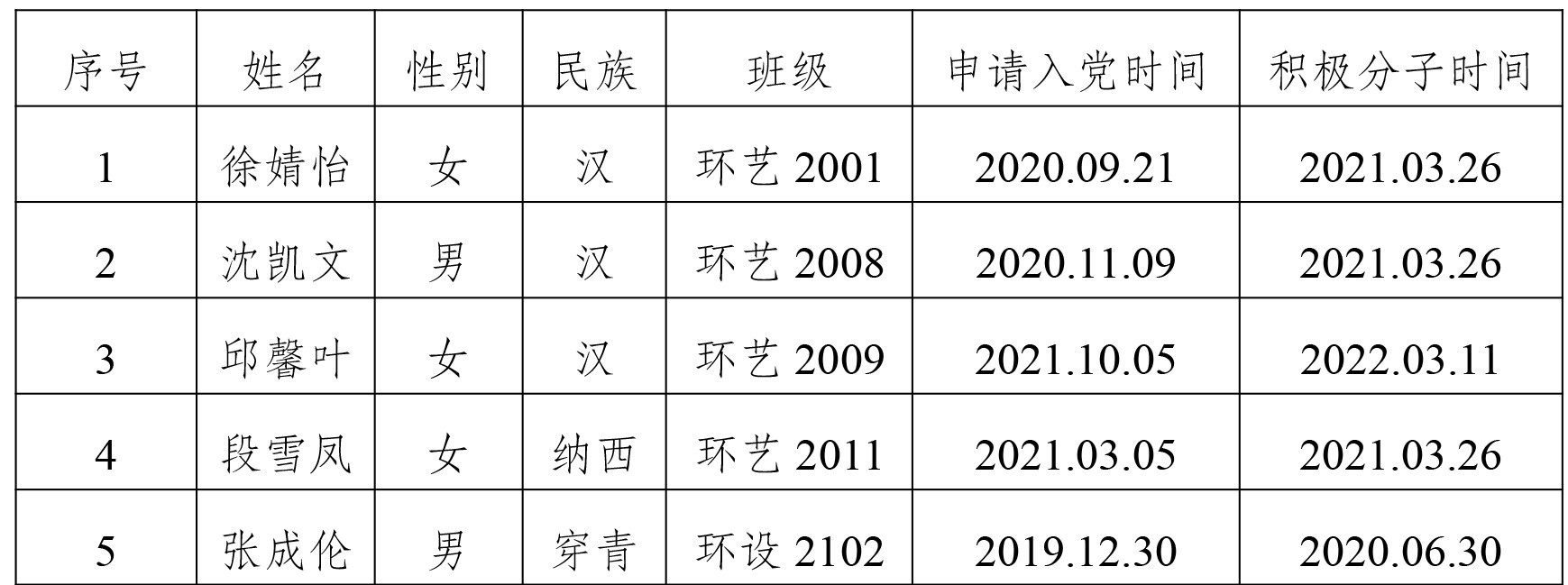 在征求党小组和党员、群众意见的基础上,经支部委员会审查,拟将徐婧怡等5位同志列为发展对象人选。根据发展党员工作有关要求,现将其有关情况公示如下,经党支部培养教育和考察,该同志已基本具备党员条件,在征求培养联系人、党员和群众意见的基础上,经中共北海艺术设计学院建筑与环境艺术学院学生第一支部委员会2023年3月12日讨论同意列为发展对象人选。