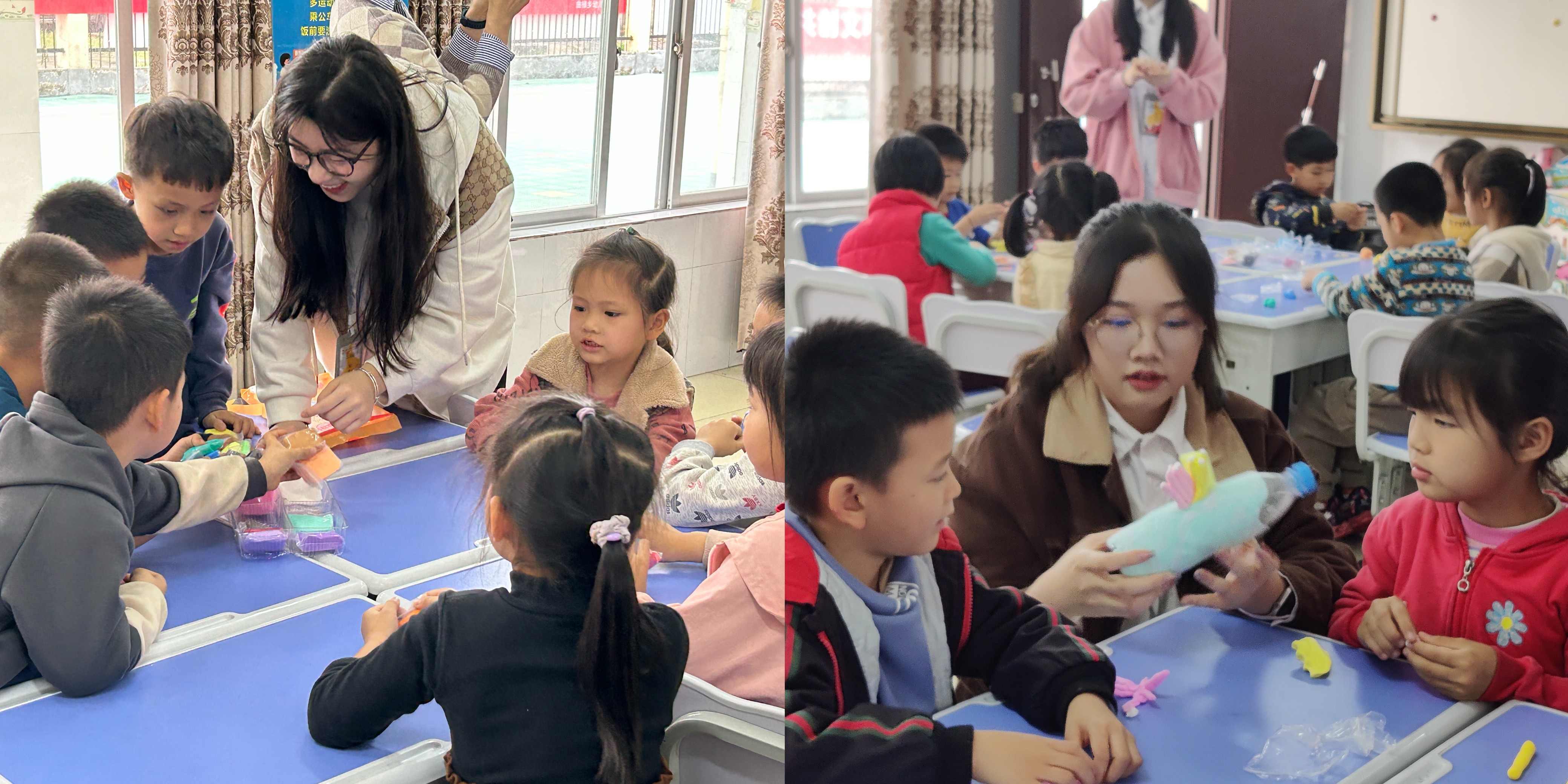 学前教育专业的学生在给幼儿园大班的小朋友上手工课