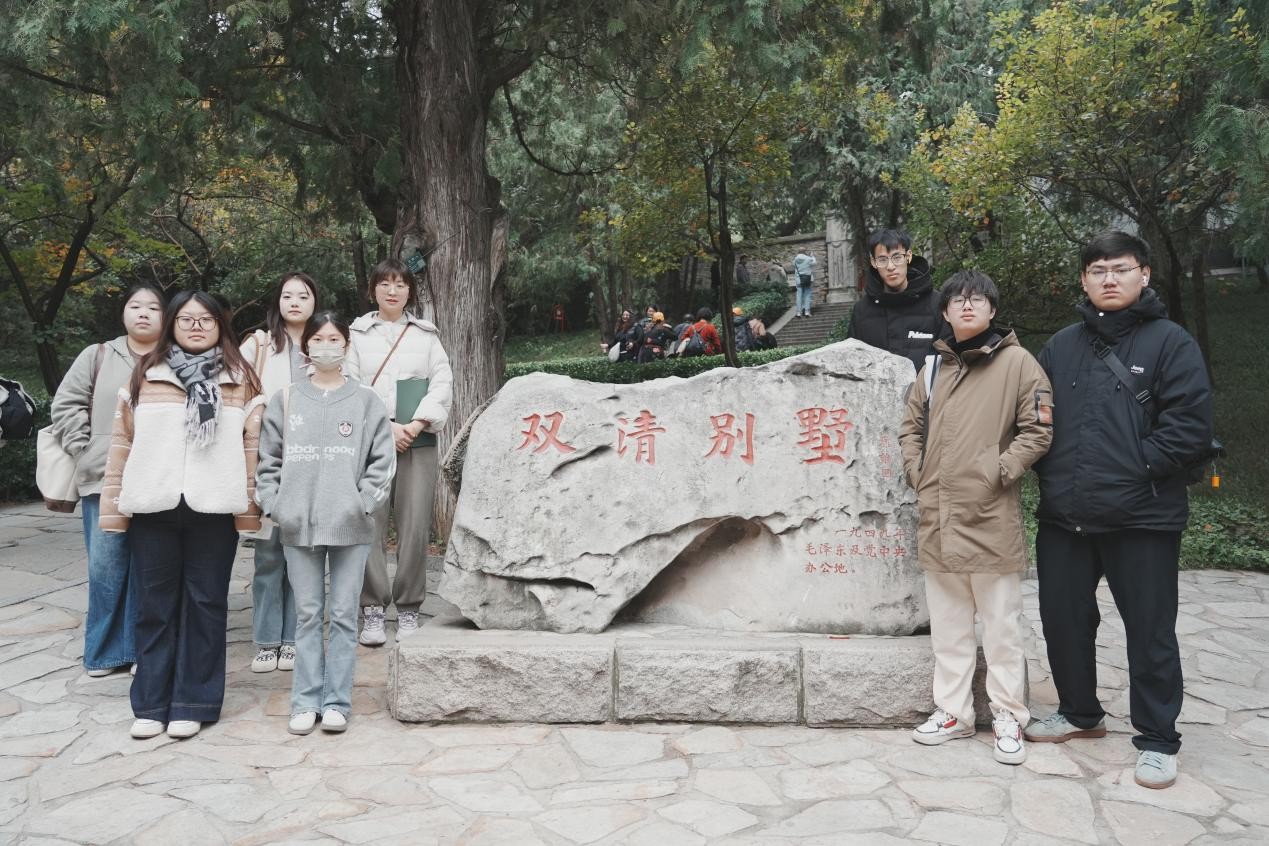 走进贝聿铭设计的香山饭店,教师团队结合建筑创作背景,引导学生对比分析新中式风格中“粉墙黛瓦”与皇家园林元素的共生关系,重点拆解后花园“小中见大、步移景异”的经典造景技法,让学生直观感受传统造园智慧在现代设计中的传承与创新。在双清别墅教学现场,课程氛围从专业研讨自然过渡到思政教育:教师讲述毛泽东同志 “进京赶考”期间的革命历程,通过六角亭“拿报纸”的历史场景解读,让学生理解建筑空间背后承载的精神内核。这一环节不仅实现“景观认知—历史共情—价值认同”的教学递进,更让“大思政课”与专业教学实现了无缝融合。