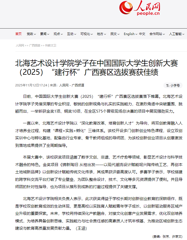人民网:北海艺术设计学院学子在中国国际大学生创新大赛(2025)“建行杯”广西赛区选拔赛获佳绩