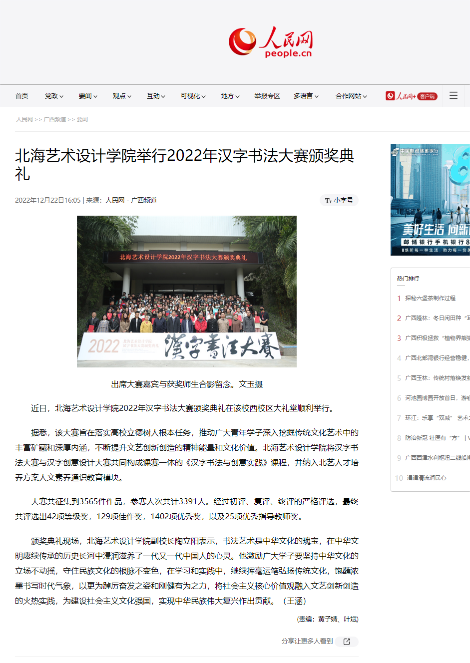人民网:北海艺术设计学院举行2022年汉字书法大赛颁奖典礼