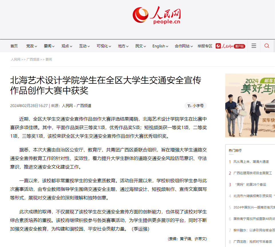 人民网:北海艺术设计学院学生在全区大学生交通安全宣传作品创作大赛中获奖