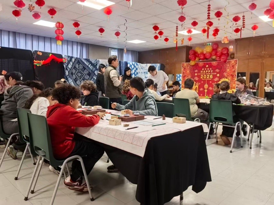 本次交流活动为期九天(2月18日至26日),覆盖当地青少年活动中心、市政广场、城市剧场等多个核心场所,形成多点联动、全域覆盖的文化传播格局。2月18日,我校团队率先走进玛丽-克洛德-瓦朗坦小学休闲中心、朱尔-费里小学休闲中心以及小格罗莱农场小学休闲中心三大青少年活动中心,开设非遗簪花制作、陶艺动物塑形、植物染扎染、篆刻艺术、传统手工葫芦工艺等中国非遗文化体验课程,同步开展中国古典舞教学与传统服饰文化展示体验活动。现场互动热烈,法国青少年与市民通过亲手实践,近距离感受中国传统手工艺的精湛技艺与文化内涵,有效激发了对东方文明的探索热情。