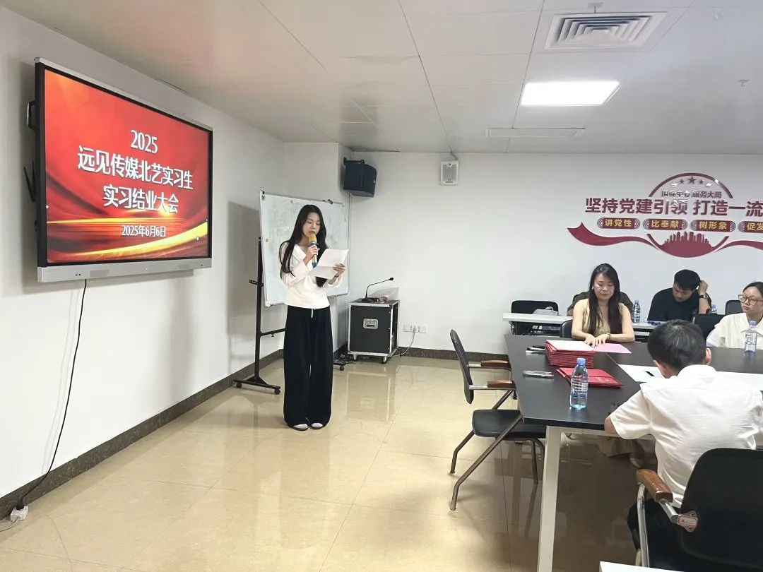 在远见传媒的实习结业大会上,实习生代表顾景妍进行了发言,回顾了实习期间的学习、工作成果以及实习心得体会,并对各企业提供的工作实践机会和平台表示由衷的感谢。