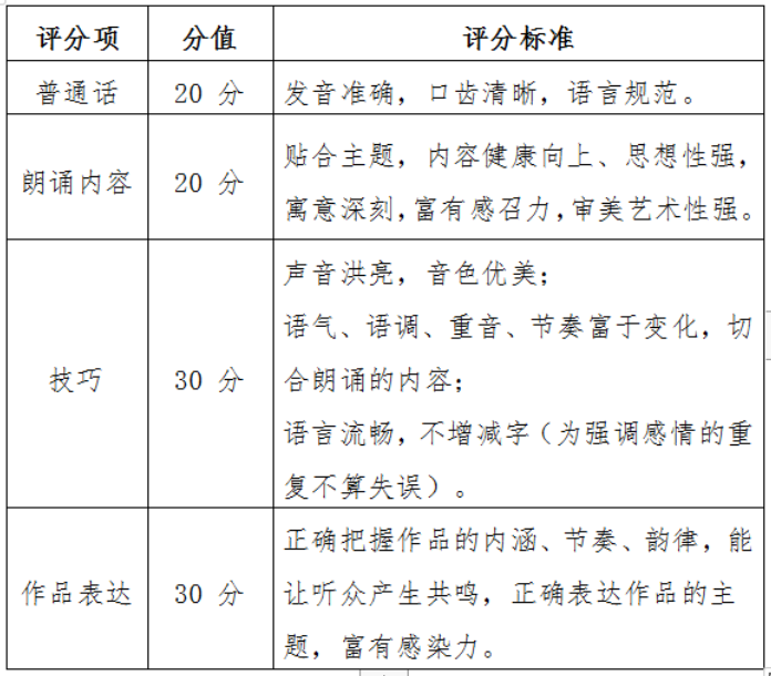 备注:朗诵内容时长控制在3~5分钟之内现场超时或不足,或现场未脱稿,均属于扣分项,扣分标准以现场评委商定结果为准。