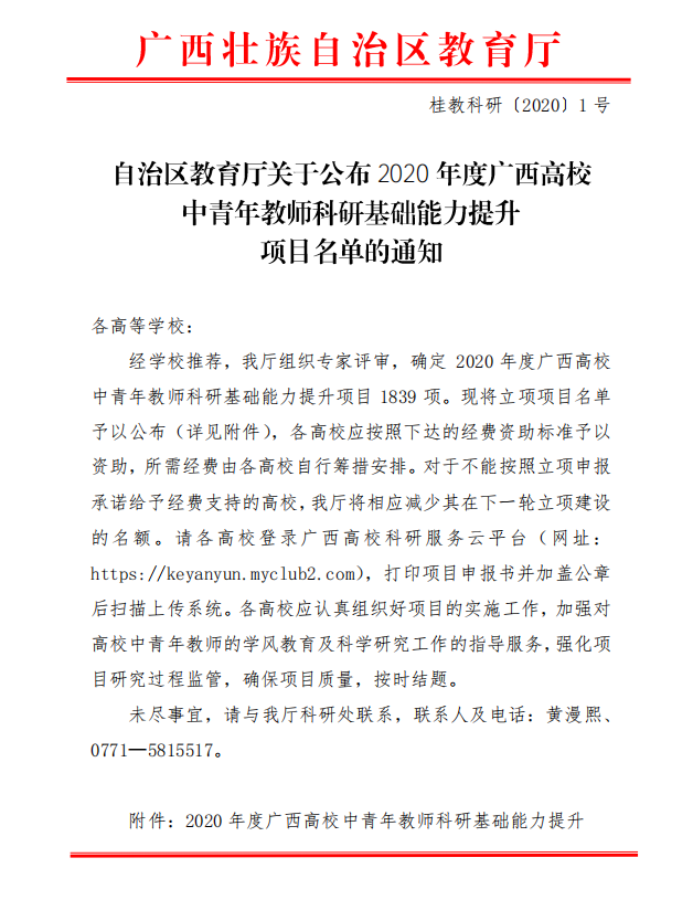 自治区教育厅关于组织申报2020年度广西高校中青年教师科研基础能力提升项目名单的通知