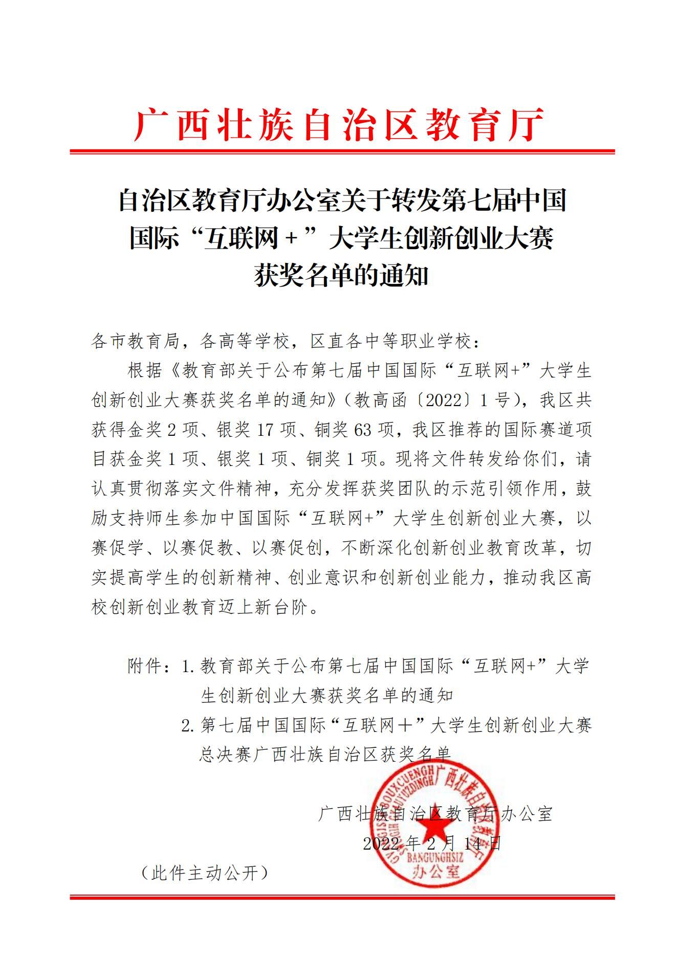 自治区教育厅办公室关于转发第七届中国国际“互联网+”大学生创新创业大赛获奖名单的通知