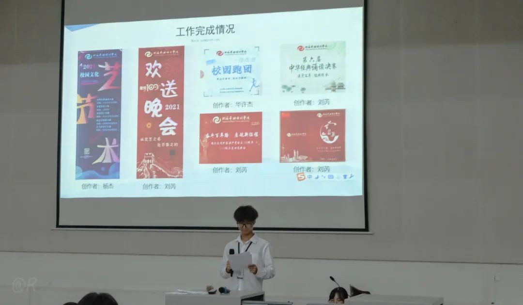 新媒体宣传部成员杨杰主讲本学期部门的工作总结。首先对部门工作完成情况进行了总结,接着对本学期所制作的海报、幕布等作品进行了展示。最后针对部门各个分部存在的问题提出了相应详细的解决方法,并表示在新学期会对不足之处予以改进,为学校各项活动的顺利开展做贡献。