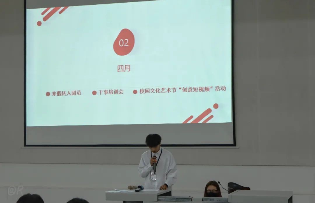 组织部成员张睿主讲本学期部门的工作总结。从五个部分进行工作总结,提出了与分团委沟通交流较少,导致通知工作出现差错等问题,在新学期的工作中将这些不足之处予以改进。