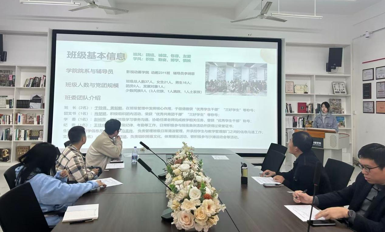 评审会现场气氛热烈,7个参评班级代表依次登台,通过PPT展示,全面汇报了班级的建设成果。从思想建设、课堂出勤率、专业成绩优良率等学风建设硬指标,到志愿服务时长、学科竞赛获奖情况等实践成果,各班级代表用详实的数据和生动的案例,充分展现了动画学子积极向上、团结奋进的精神风貌。评审小组结合现场表现及班级材料审核进行综合评分。