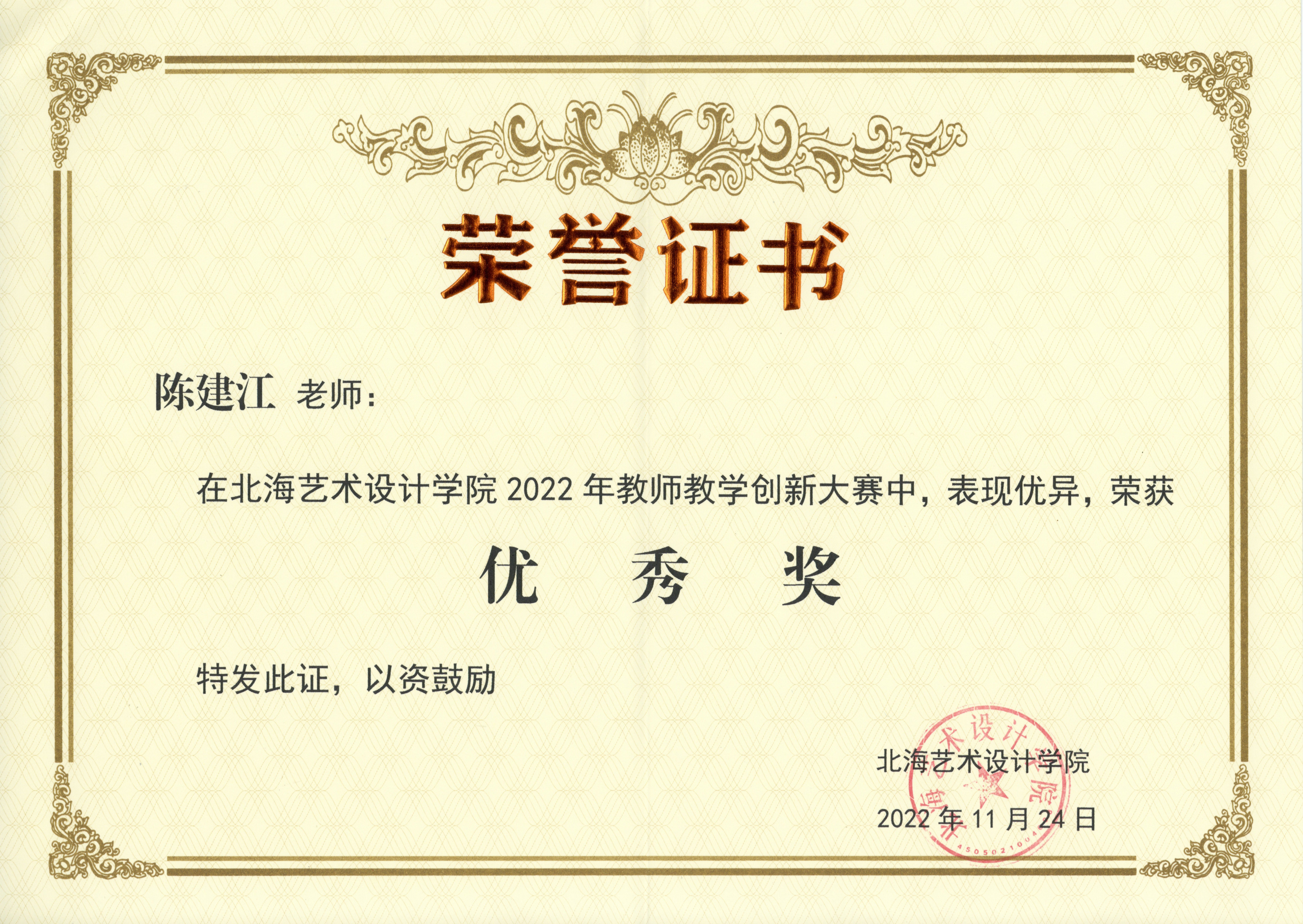 科研反哺教学,教书是为育人,精心方有成效。踏实的教学态度,经年累月的沉淀,最终将立德树人、为国育才的理念灌输到教学实践的点滴中去。培养出了一批批茁壮成长起来的优秀大学生,陈建江老师也获得了相应的荣誉。2022年,被评为北海艺术设计学院“师德标兵”称号;参加北海艺术设计学院教师教学创新大赛,荣获优秀奖。这些年,指导学生多次参加各类专业作品展览并获奖,如指导学生钟文竹参加由自治区农业农村厅举办的2021年第三届“广西稻渔丰收节”稻渔艺术作品比赛中荣获三等奖;2022年,指导学生林佳婕参加广西美术家协会举办的第二届广西工笔画作品展入选,荣获优秀奖;2021年,指导学生霍远琴创作的作品《守护·憩》,入围由中国美术家协会举办的“新征程奋进粤港澳大湾区全国中国画、油画展”。