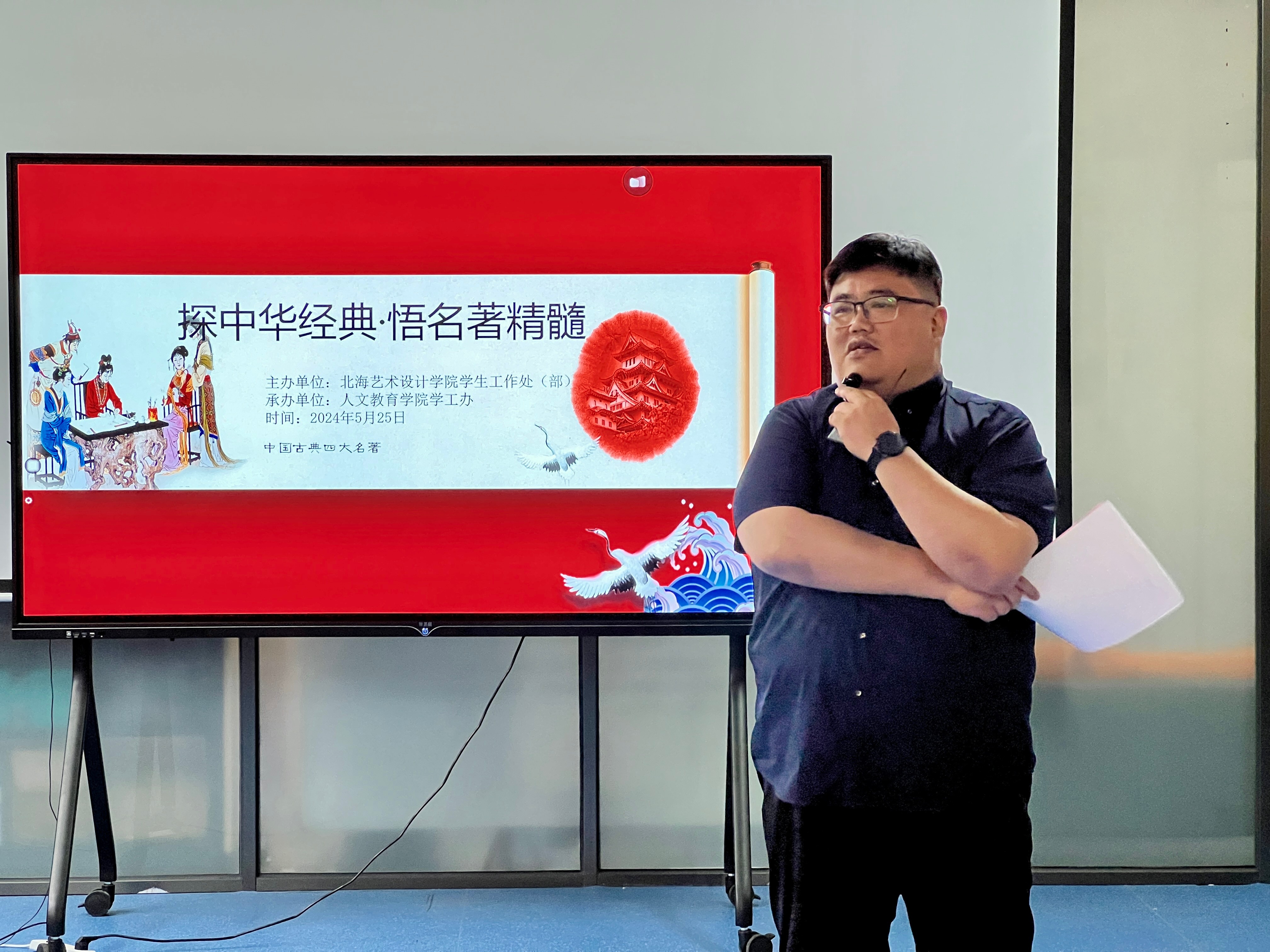 为全面贯彻党的二十大精神,积极响应国家文化强国建设的号召,深入推进全民阅读活动。北海艺术设计学院学生工作处(部)主办,人文教育学院承办的“探中华经典 · 悟名著精髓”决赛于2024年5月25日在图书馆多功能厅举办。党委副书记刘承初、学工处处长班媚、人文教育学院副院长李水亮、第四党总支副书记邓欢、哲学教研室主任覃传茵以及汉语言教研室副主任姜玮等领导和嘉宾莅临比赛现场。