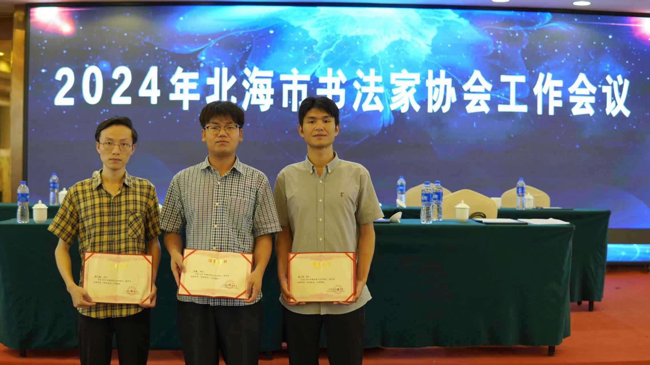 北海市书协主席陈美东在会议上作2023年工作报告,并宣读了2024年新加入协会会员名单,北海艺术设计学院书法学院学生共计29人入会。随后,会议中对2023年年度优秀会员进行表彰,其中我院喻广林书记、李鑫主任以及张天赋老师获此殊荣。