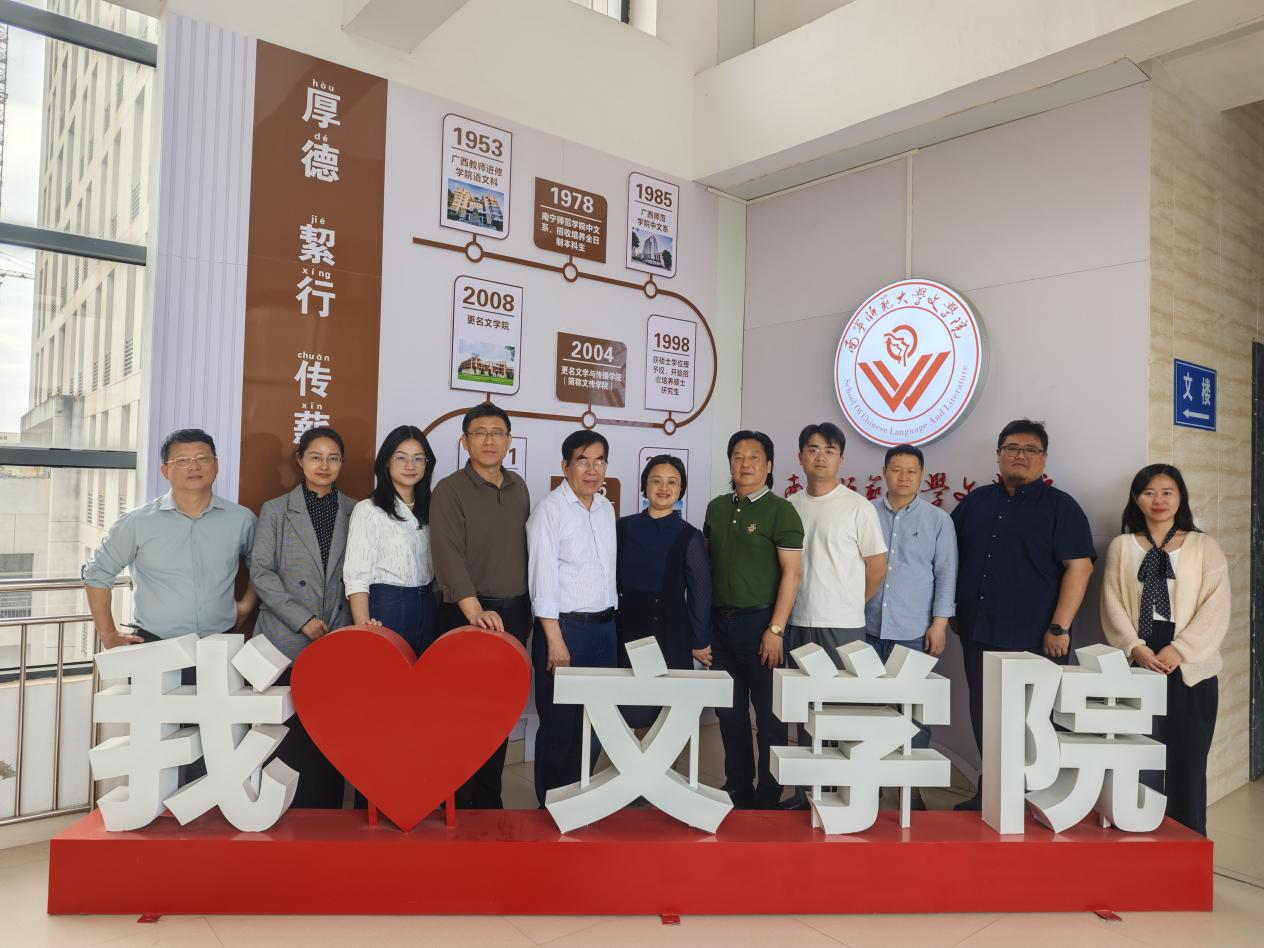 为进一步优化人才培养方案,提升人才培养质量,2025年4月16日下午我校文学院院长黄宇鸿教授带领学院专业教师团队一行6人,赴南宁师范大学文学院开展人才培养方案调研交流活动。南宁师范大学文学院院长石勇党委书记旷晓霞及相关专业负责人热情接待我院老师