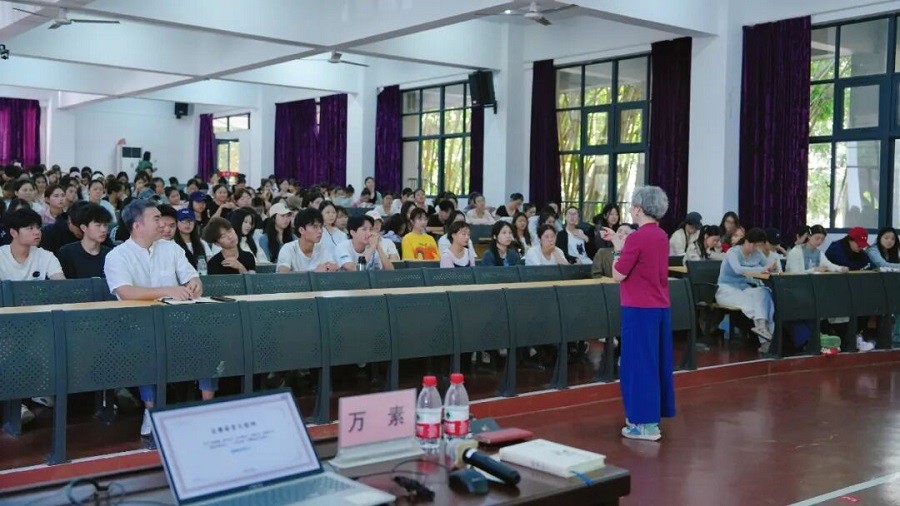 万素教授以其经典作品《国风》为切入点,通过富有感染力的艺术阐释,快速拉近与师生的距离,随后围绕“舞蹈在哪里?”这一核心命题展开深度探讨。她先后抛出“为何钟情舞蹈?”“舞蹈为何成为部分群体的专属热爱?”等问题,引导师生从感性认知向理性思考过渡,层层递进地剖析 “舞蹈究竟是什么”。万素教授指出,舞蹈的核心价值始终在于唤醒大众对生命与情感的感知。她结合自身年少与舞蹈结缘的经历,表明舞蹈是兼具视觉张力与情感温度的艺术形式,它既是生命的直接呼唤、情感需求的本真表达,也是人体美学语言的自然展现与艺术转译,其诞生根源正是人类对生命与情感的表达需求。