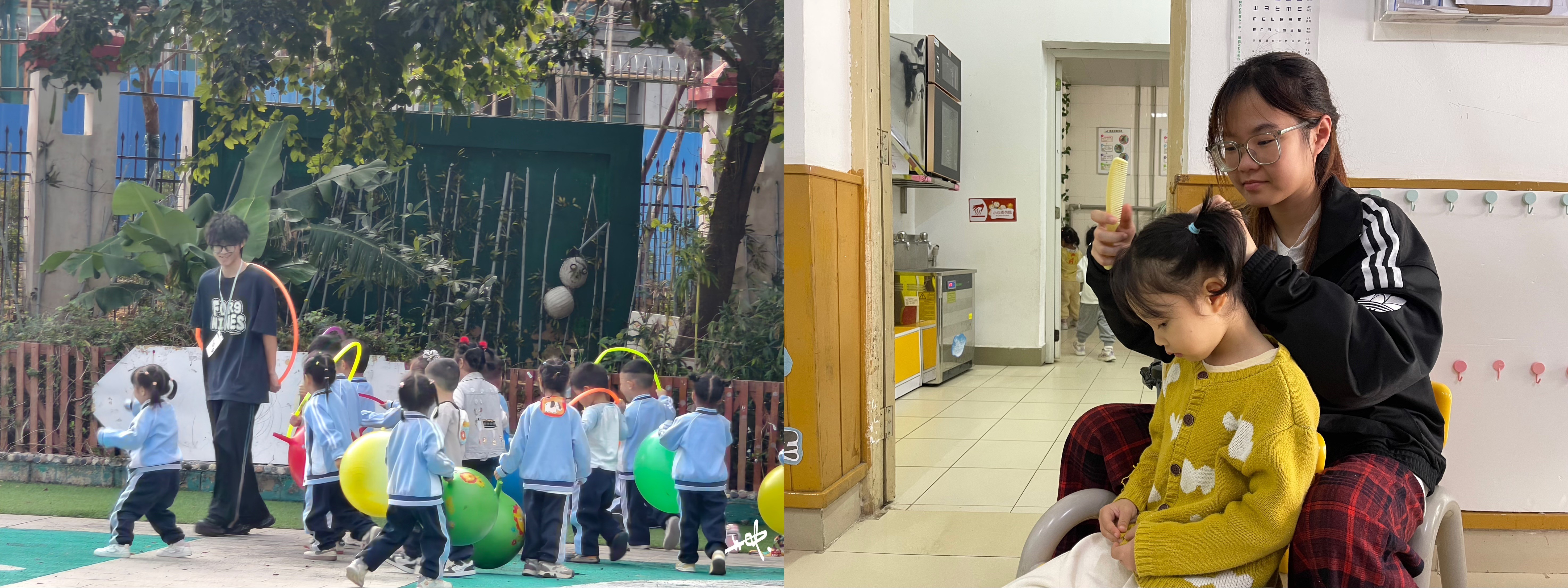 幼儿园负责人于简短的欢迎仪式上向同学们讲解了注意事项,随后同学们按分配进入对应班级开启见习。见习期间,同学们以饱满的热情跟随带班教师参与幼儿一日生活的每个环节从区域活动的组织引导、教学活动中的教具辅助,到户外游戏的安全看护,大家都认真观察、主动实践,将课堂所学的专业理论转化为具体的保教行为。在与孩子们的朝夕相处中,同学们不仅积累了丰富的实操经验,更深刻体会到幼儿教师岗位的责任与温度。学前2301班缪仁文参与幼儿园环创            学前2301班潘慧洁组织幼儿户外活动