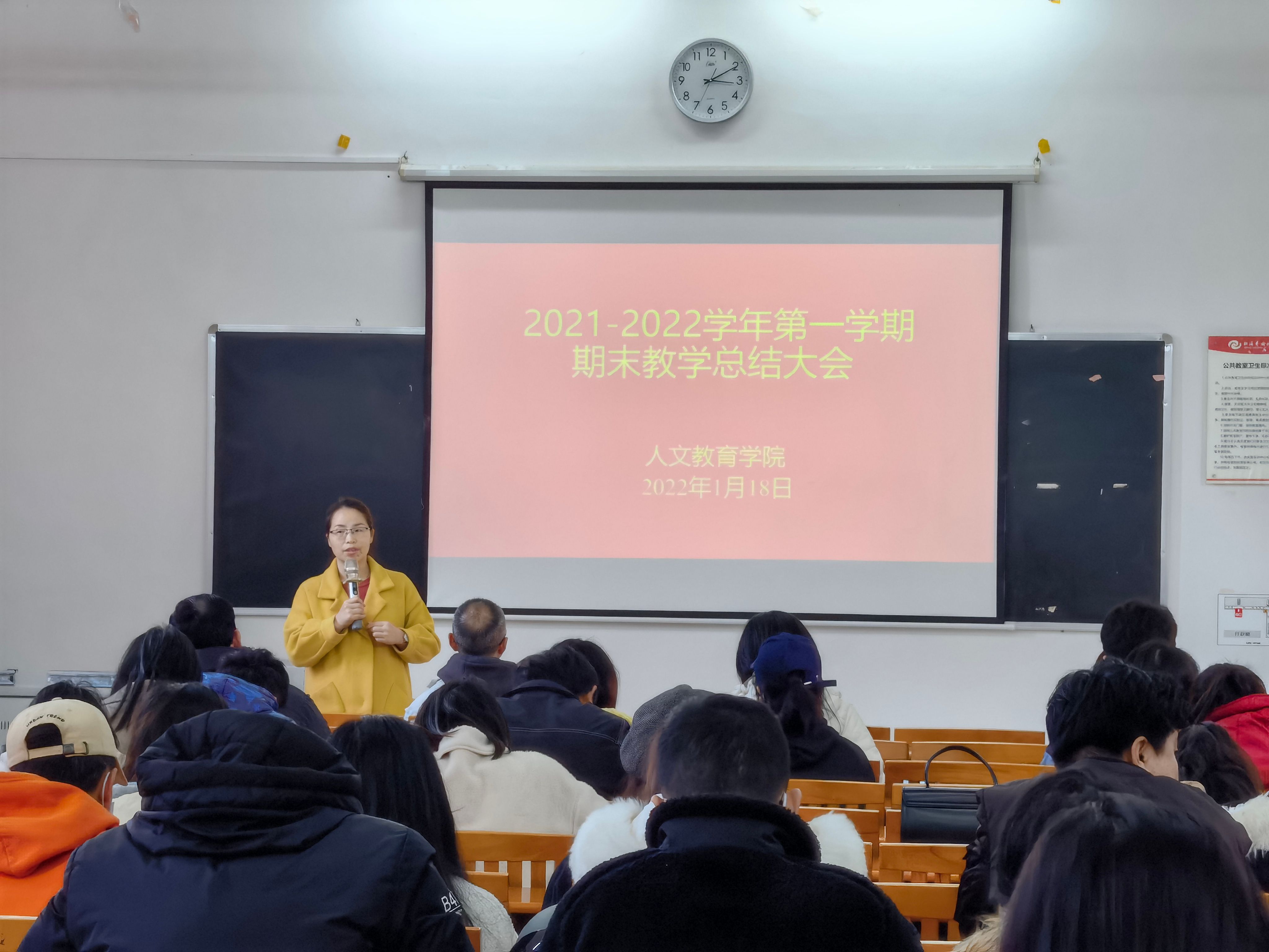 为及时总结我院本学期教学工作情况端正教师思想态度、明确教学工作目标,提升教学工作质量,推进教学评估工作有序开展,1月18日我院伦理楼101教室召开期末教学工作总结大会。人文教育学院全体教师参加了本次会议。