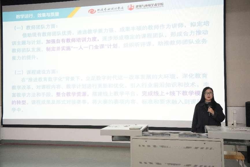 教务处副处长吕雅婷接着发言,她提到教学综合改革的重要性,并高度肯定了建筑与环境艺术学院在自治区教学数字化大赛中取得的成绩。她强调需要带动学生的积极性和参与度,开展混合式课程教学,并建议先拥有自己的教学理念和设计。