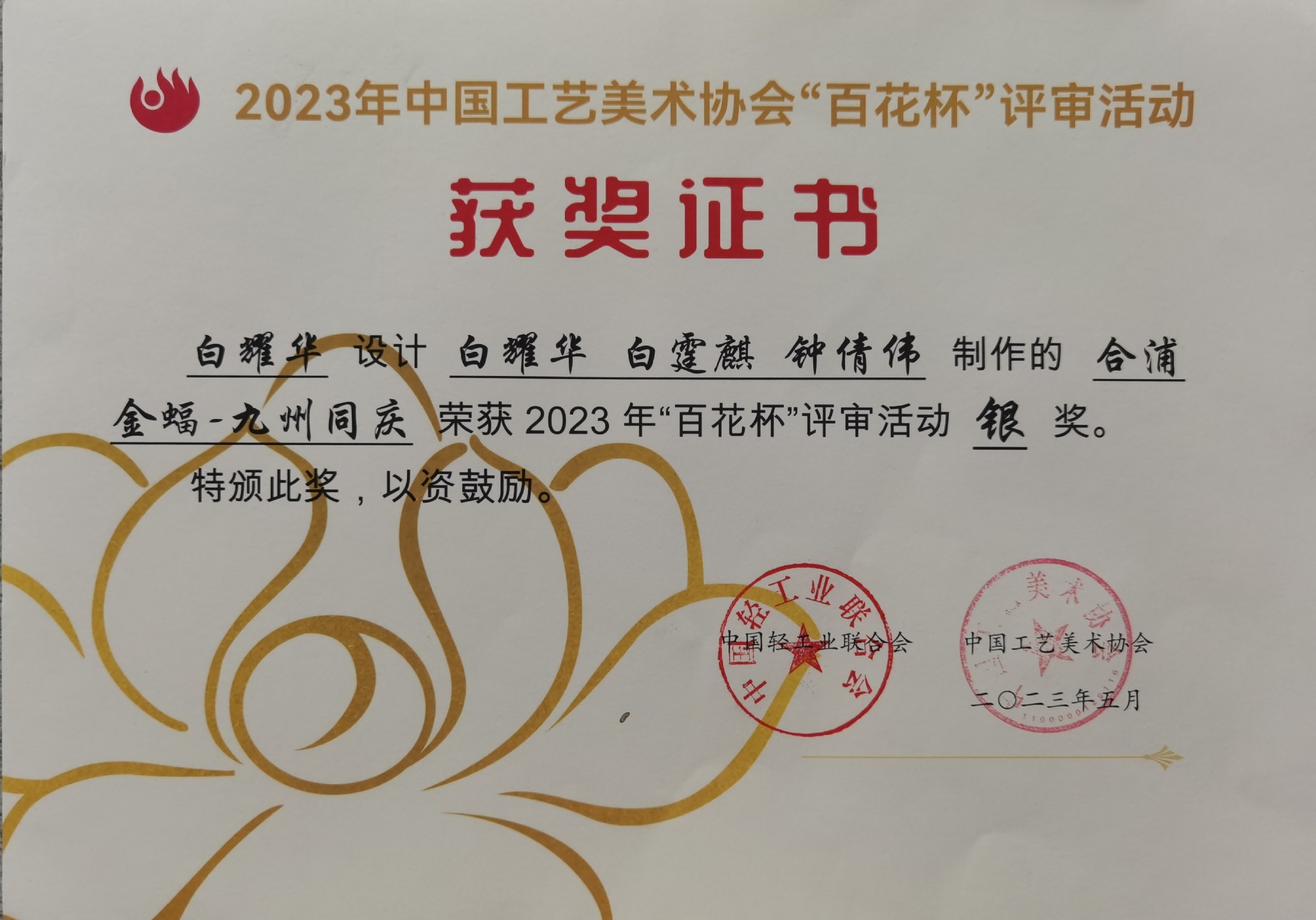 多年来,白耀华在全国工艺美术大赛中屡获殊荣,成为合浦角雕的杰出代表。2012年以来,他每年创作的作品都在大赛中斩获国家级金银奖,其中荣获6次国家级金奖、5次国家级银奖、2次国家级铜奖。他的代表作《中国梦》《和鸣百财》《花好月圆》分别在2014年、2016年、2018年全国工艺美术大师精品展“百花杯”上荣获金奖。这些荣誉不仅是对白耀华个人技艺的高度认可,更为合浦角雕在全国雕刻艺术领域赢得了一席之地,让这门古老的技艺焕发出新的光彩。