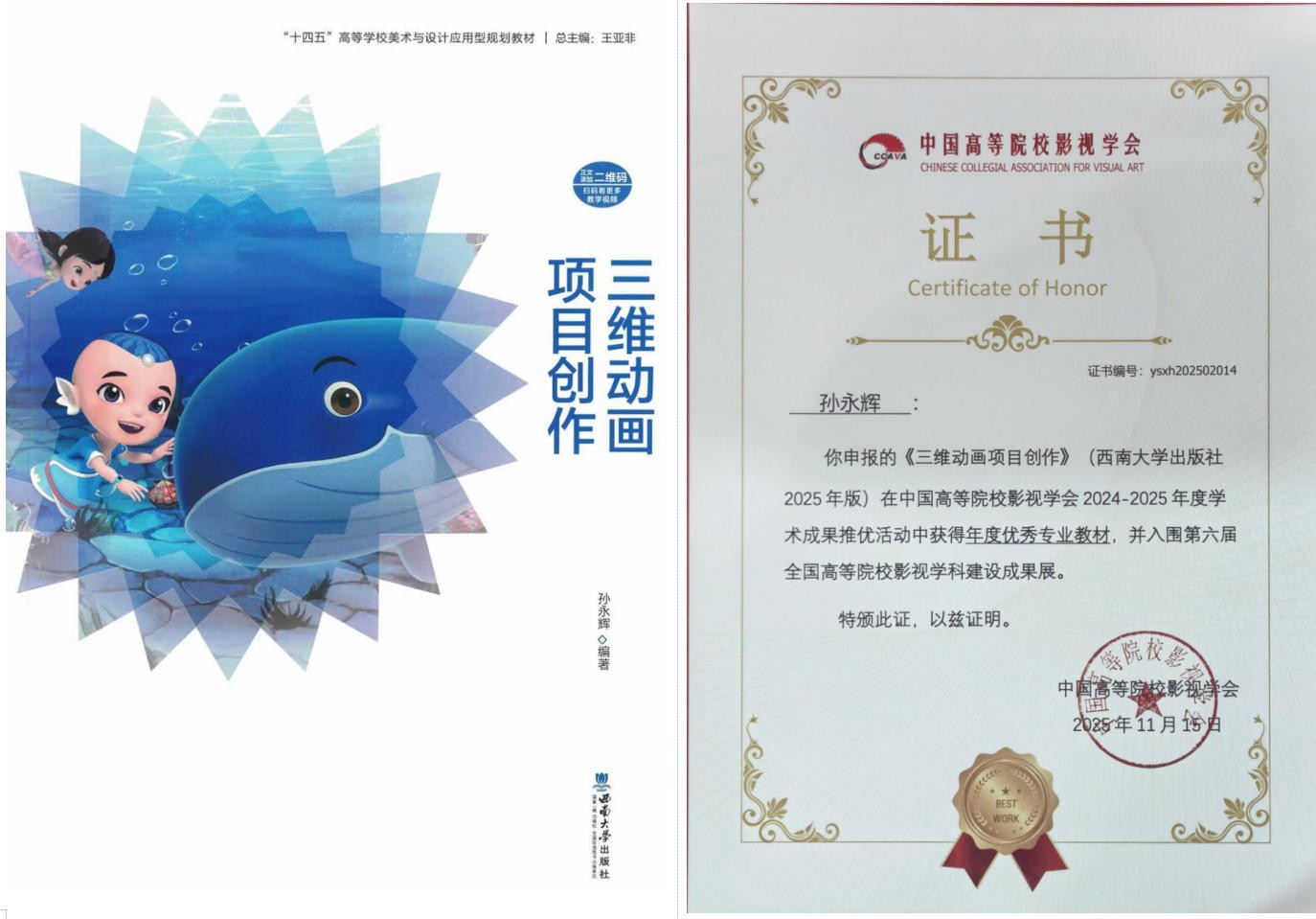 孙永辉老师编写的《动画项目创作》教材,在本次学术成果推优活动中获评“年度优秀专业教材”,同时入围第六届全国高等院校影视学科建设成果展。该教材紧密对接动画专业教学实践与行业发展需求,内容兼具理论深度与实操指导性,系统梳理动画项目创作全流程要点,为高校动画人才培养提供了优质教学资源。此次双重荣誉的获得,是对教材专业价值与编写质量的认可,也体现了学院在影视动画学科教材建设与教学研究领域的扎实积累。