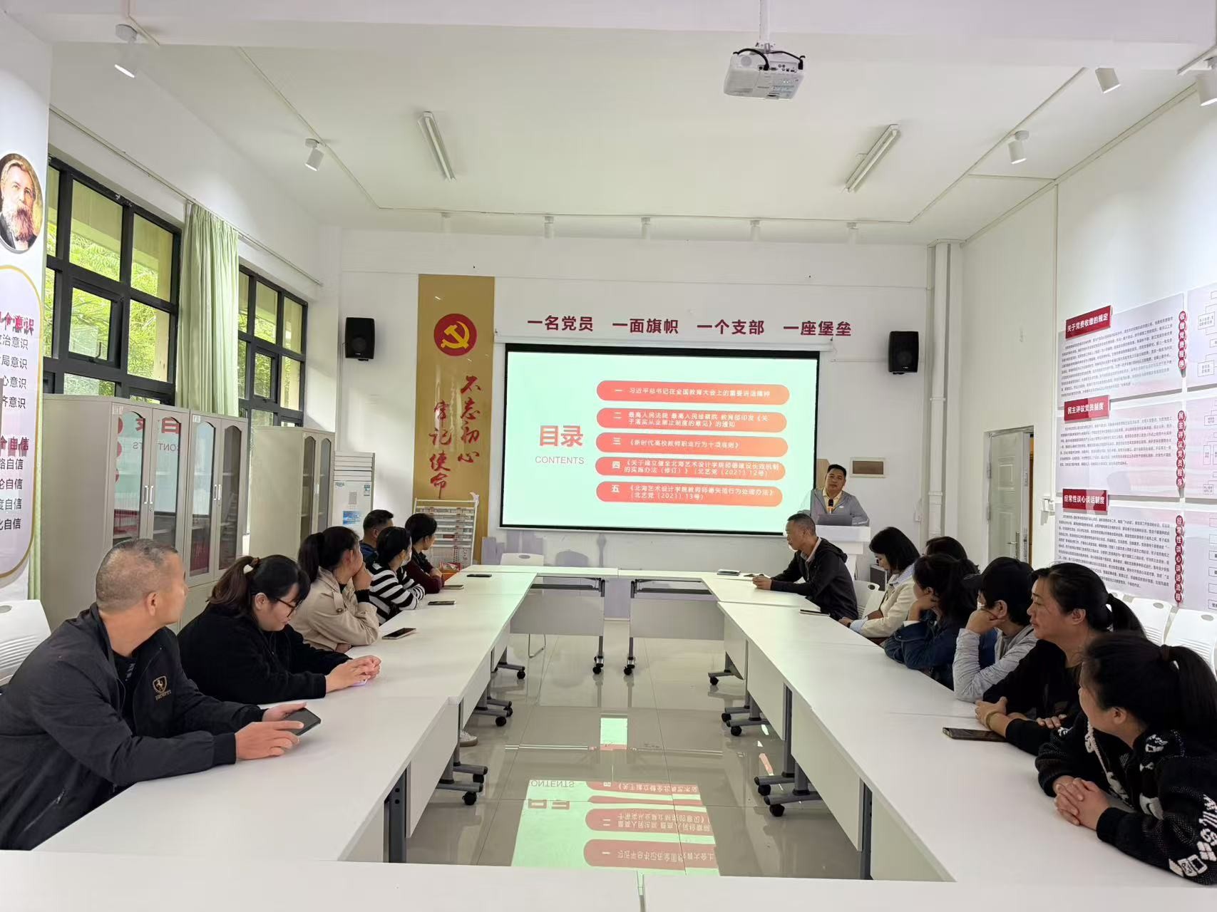 会议认真学习了习近平总书记在全国教育大会上的重要讲话精神;最高人民法院 最高人民检察院 教育部印发《关于落实从业禁止制度的意见》的通知;《新时代高校教师职业行为十项准则》;《关于建立健全北海艺术设计学院师德建设长效机制的实施办法(修订)》(北艺党〔2021〕12号);《北海艺术设计学院教师师德失范行为处理办法》(北艺党〔2021〕13号)共五项内容。