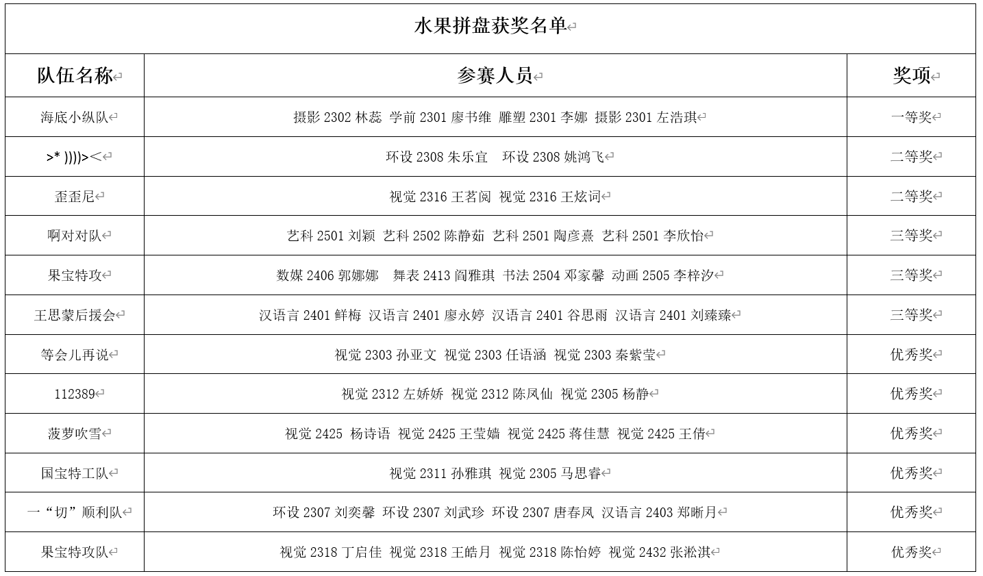 此次水果拼盘大赛,既是一次校园文化的趣味实践,也是北艺学子艺术素养的生动展现。未来,学校将继续举办更多兼具创意与趣味的校园活动,让同学们在实践中感受艺术之美,在协作中收获成长。(高泽娅/摄)